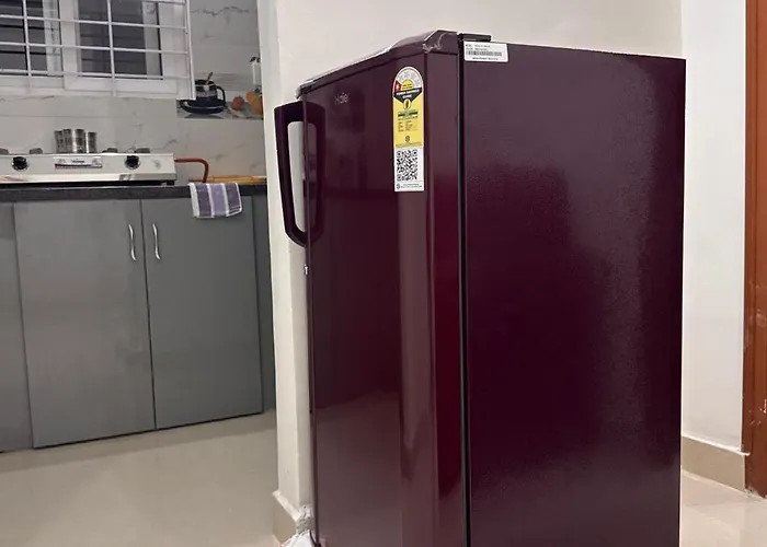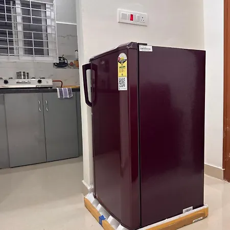 To enhance your comfort, The Sapphire Nest - Cozy Premium 1Bhk Near Aig - Kondapur Apartment features a full kitchen with a refrigerator provided.
